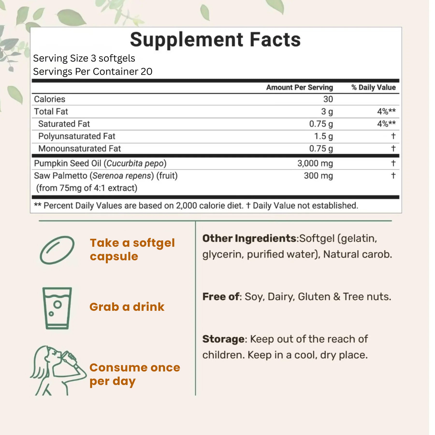Pumpkin seed oil with saw palmetto is a natural formula rich in compounds like phytosterols and essential fatty acids that work together to support bladder and prostate health.