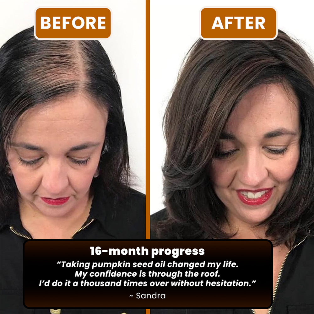 Pumpkin seed oil and saw palmetto contain plant based compounds called phytosterols that block DHT naturally, reducing hair shedding and boosting hair growth.